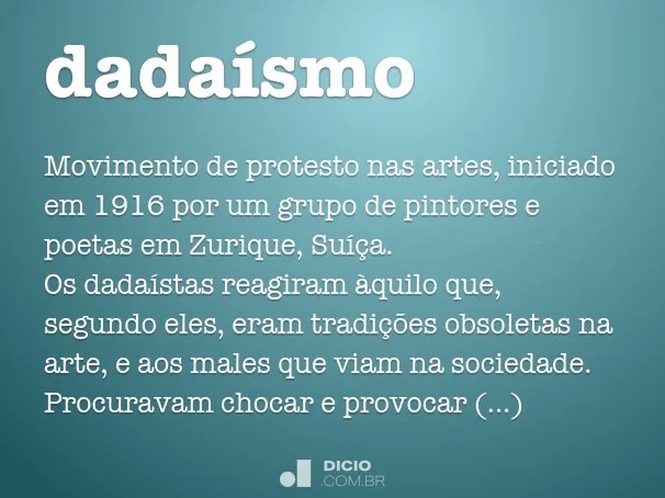 Il dadaismo deve il proprio nome all'espressione 'dada', una parola che non significa nulla e ricorda il primo balbettio emesso dai bambini... Il dadaismo deve il proprio nome all'espressione 'dada', una parola che non significa nulla e ricorda il primo balbettio emesso dai bambini. Os defensores desta nova corrente defendiam que todas as crenças morais, políticas e estéticas, tinham sido.